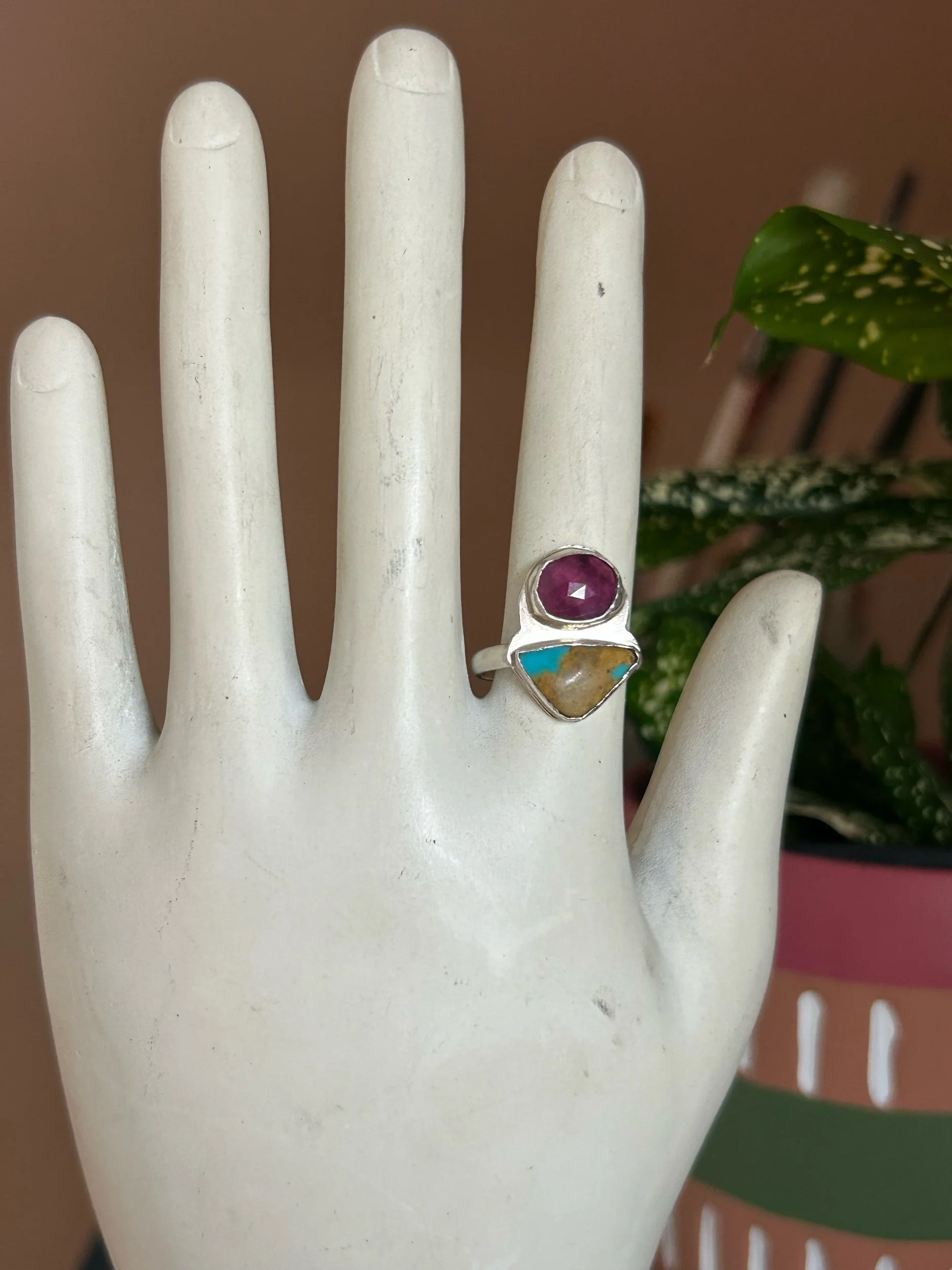 Image 1 of 1 Pink Sapphire and Turquoise Ring $100.00 A rose cut pink sapphire and turquoise cabochon set in sterling silver. Size 6. Add To Cart Added! A rose cut pink sapphire and turquoise cabochon set in sterling silver. Size 6.