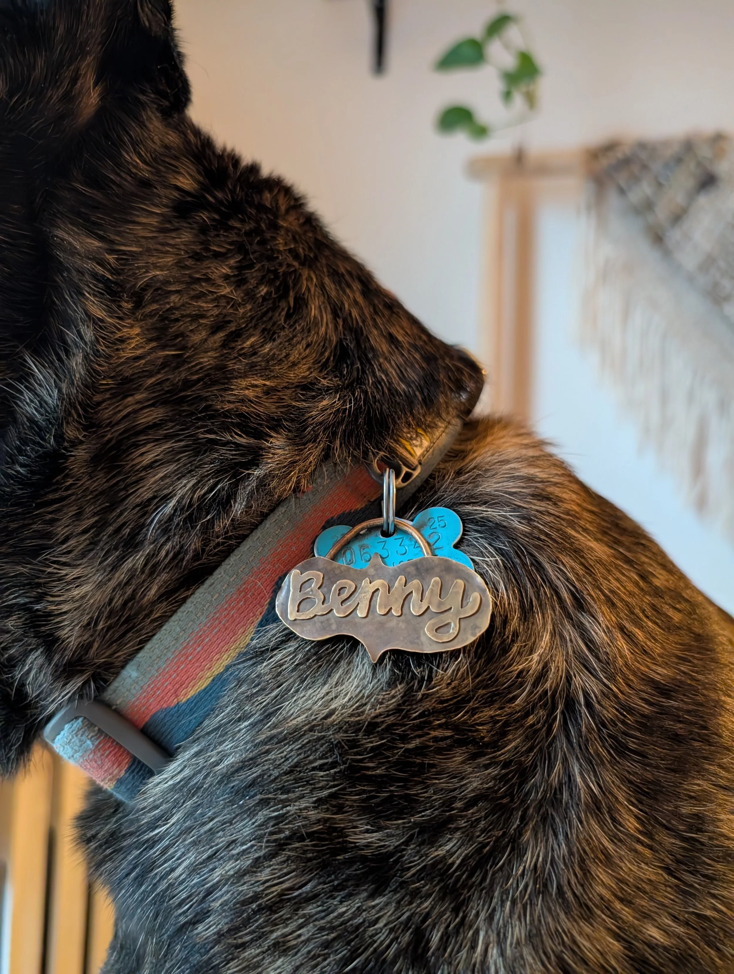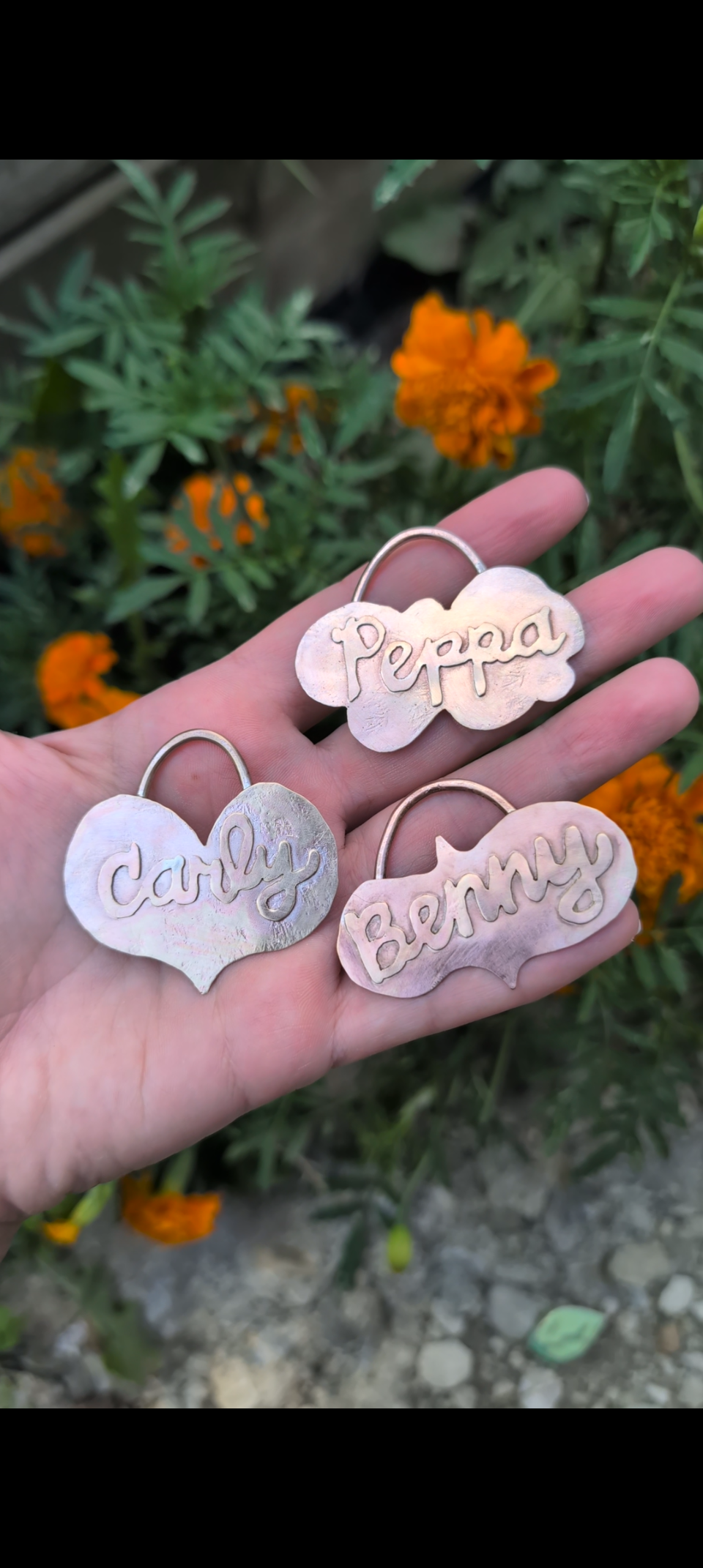 We're so excited to offering functional adornments for your furry friends. Dogs and smaller cat tags are both available. Tags include a handsawed name tags with a stamped phone number on the back. Tags are made of brass and will arrive polished but tarnish over time. The photos included are “worn” tags to give you an idea of how they age.